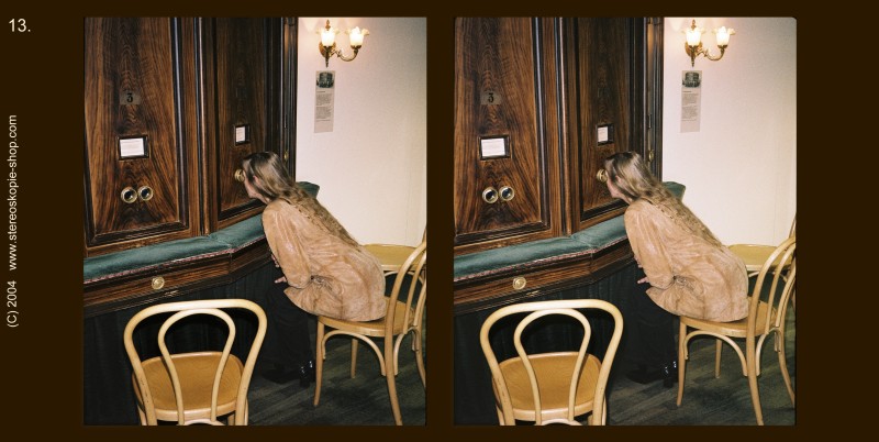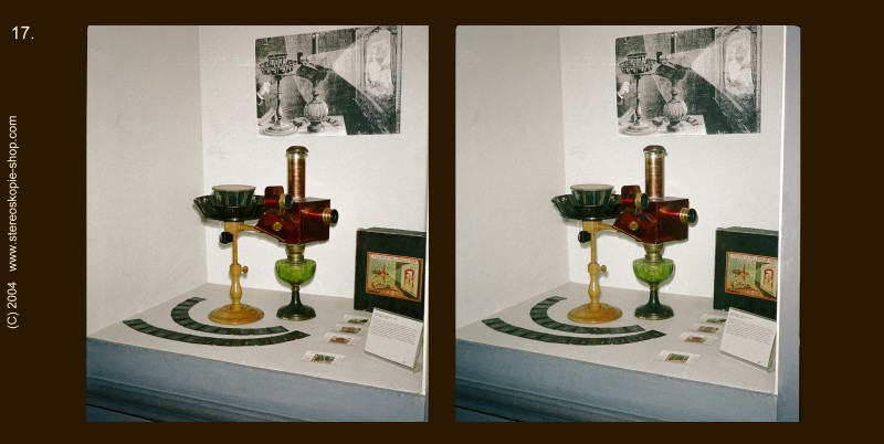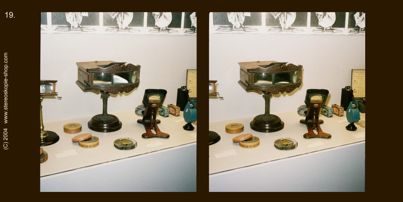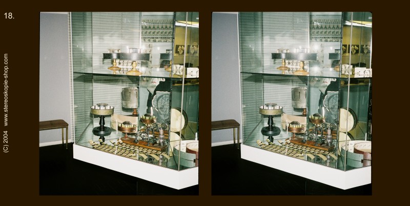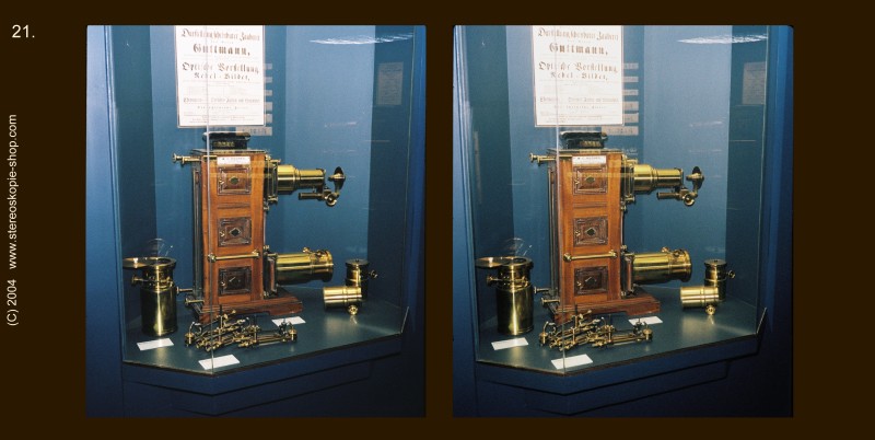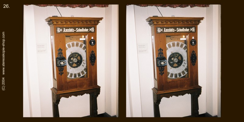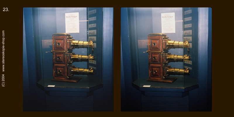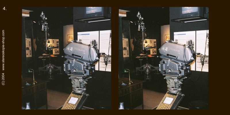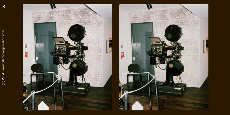 Diese Stereofotos wurden mit einer Nimslo - Stereokamera gemacht, meist wurde Blitzlicht verwendet. Diese mit einfachen Mitteln gemachten Stereofotos sollen natürlich nicht von einem persönlichen Besuch im Frankfurter Filmmuseum abhalten. Jedoch, nicht Jeder hat die Möglichkeit dieses Museum zu besuchen. Die Stereofotos sind deshalb sehr interessant, weil im Museum auch ein Stückchen vom Kaiserpanorama nachgebaut wurde. Auch verschiedene Stereokameras und Stereobetrachter sind hier ausgestellt. Es fehlen selbstverständlich auch nicht diverse, hochinteressante Geräte aus der Frühzeit des Films. |
