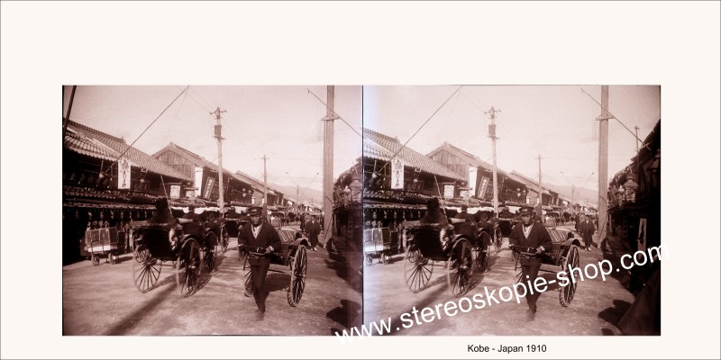 Diese Abzüge stammen von meinen alten Stereo-Glas-Negativen Format a 45*107mm. Ein Franzose hat sie ca. 1910 in Kobe - Japan gemacht. Er hat auf eine gute 3-D-Wirkung geachtet. Die letzten 2 Stereofotos sind Reproduktionen von anderen, alten Papier-Stereofotos. |