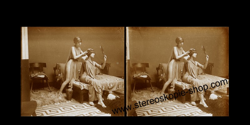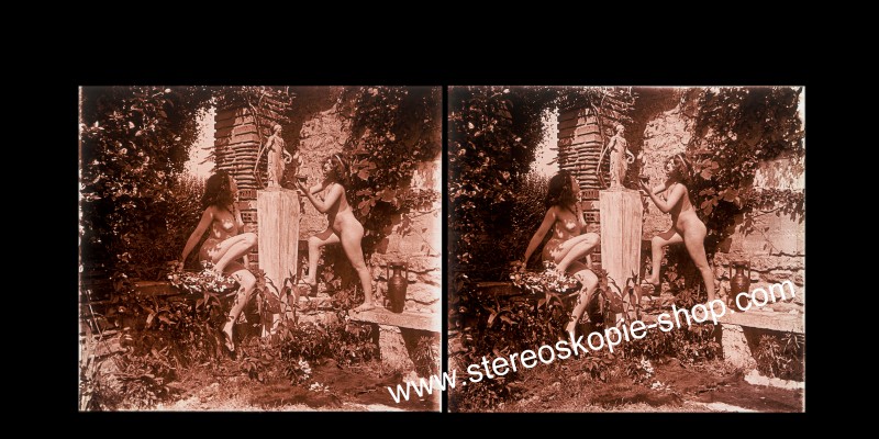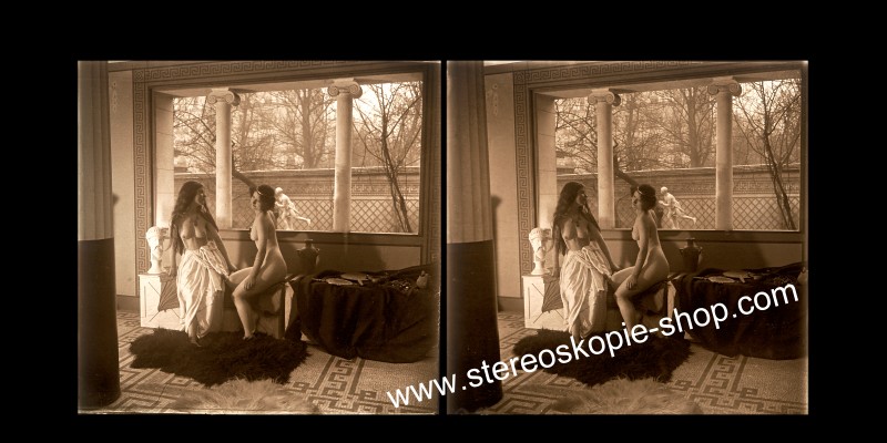 Betrachter-Hersteller um 1900 in Frankreich. In seinem eigens gebauten, stilvollen Atrium vergnügte er sich mit jungen, hübschen Models und erstellte - oder ließ Stereofotos von Ihnen erstellen. Die Originale - Glasdias im Format 47mm*107mm wurden damals absichtlich so entwickelt, dass sie eine bräunliche Farbe bekamen. In dem Stereofotobuch - LE NU STEREOSCOPIQUE - von Serge Nazarieff kann man auf Seite 141 Hinweise und Fotos finden. (Mante & Goldsmidt 1905) Diese Fotos sind sehr selten und die alten Glasdias (in meinem Besitz) waren sündhaft teuer. Warten Sie darum nicht unbedingt darauf, dass sie mal im eBay mal ein paar Originaldias erwischen. Es ist einfacher meine 1a scharfen, echten Photos von diesen alten Dias zu erwerben - ohne Höhenfehler. Hinweise auch hier http://users.telenet.be/thomasweynants/clasnud.html |