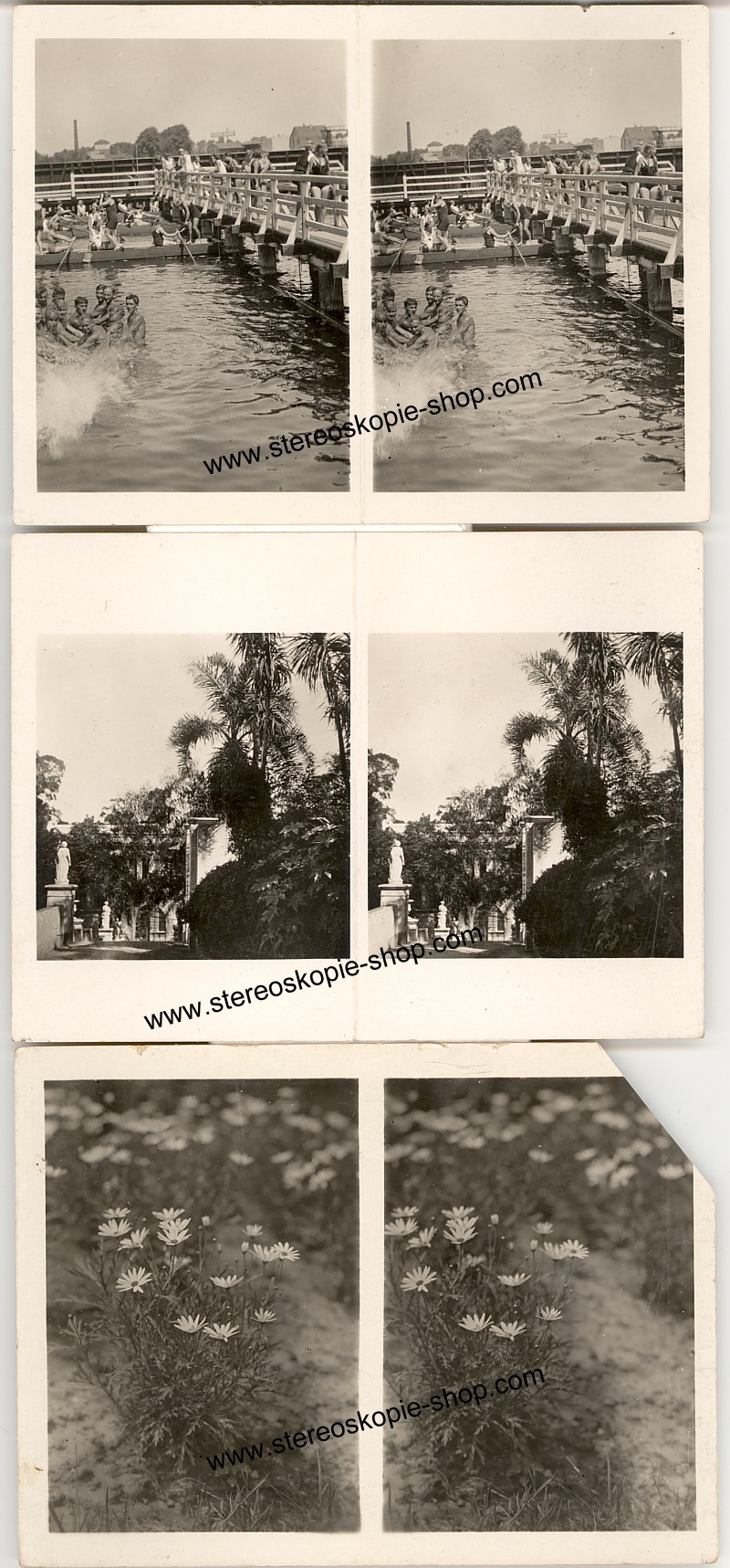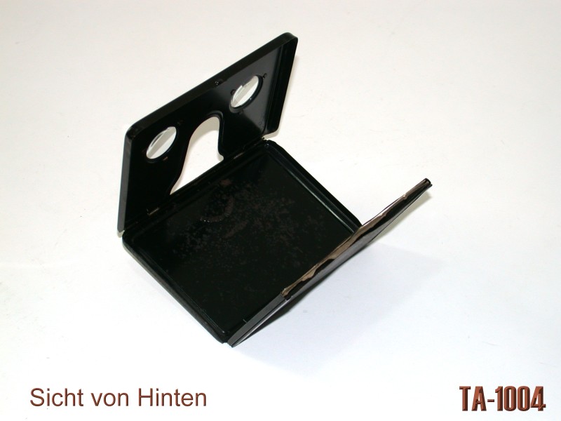 Der Indupor GMBH Stereobetrachter ist aus schwarz-lackierten Blech und lässt sich wie ein Zigarettenetui zusammenklappen. Stereofoto-Format ca. 120mm breit, 85mm hoch - ca. 1920 Die Fokussierung wird durch den vorderen neigbaren Linsendeckel bewerkstelligt. Er wurde oft mit Werbe-Stereofotos diverser Firmen verkauft oder verschenkt. Dieser hier ist gut erhalten, hat kaum Altersspuren und wird mit 6 unterschiedlichen, alten Stereofotos geliefert. |