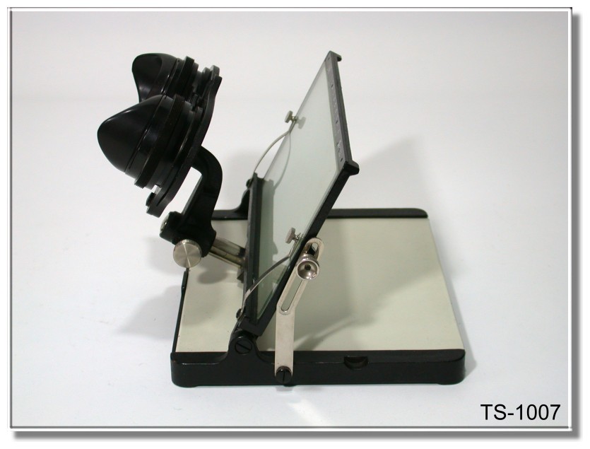 Tisch-Stereoskop der Oberklasse von Carl Zeiss in Jena hergestellt um 1910. Für Papierbilder oder Dias max. 9cm*18cm. (mit Mattscheibe), hochwertige acromatische Linsen, Augenweite verstellbar, Fokus verstellbar. Sehr stabiles Gußeisengestell Maße 19cm*15cm, Gewicht 1300 Gramm. Fast makellos, lediglich ein Haarriß am rechten Okular unten-mitte. |
